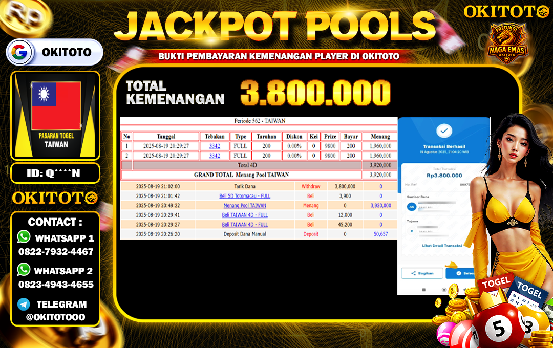 Berikut adalah bukti bahwa OKITOTO mempunyai integeritas yang tinggi dan dapat dipercaya semua orang, bukti jackpot berikut juga merupakan pembuktian yang kuat dan dapat dipertanggung jawabkan oleh pihak OKITOTO. Selamat kepada member kami dengan user id  Q****N telah memenangkan jackpot di situs okitoto.