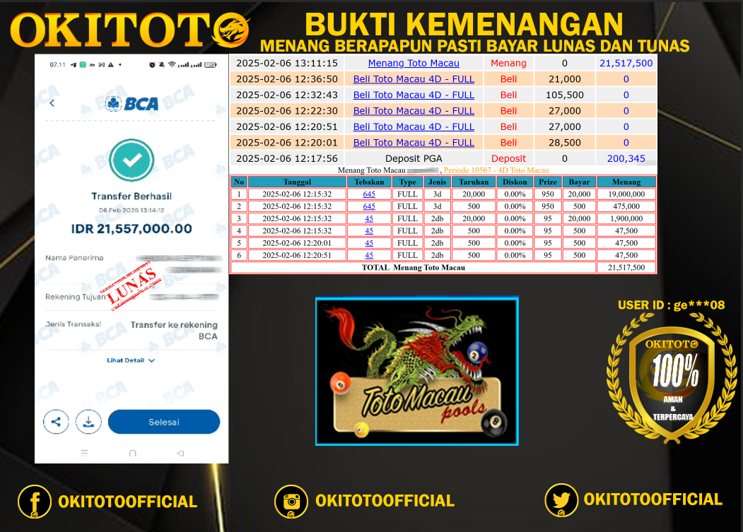 Berikut adalah bukti bahwa OKITOTO mempunyai integeritas yang tinggi dan dapat dipercaya semua orang, bukti jackpot berikut juga merupakan pembuktian yang kuat dan dapat dipertanggung jawabkan oleh pihak OKITOTO. Selamat kepada member kami dengan user id ge***08 telah memenangkan jackpot di situs okitoto.
