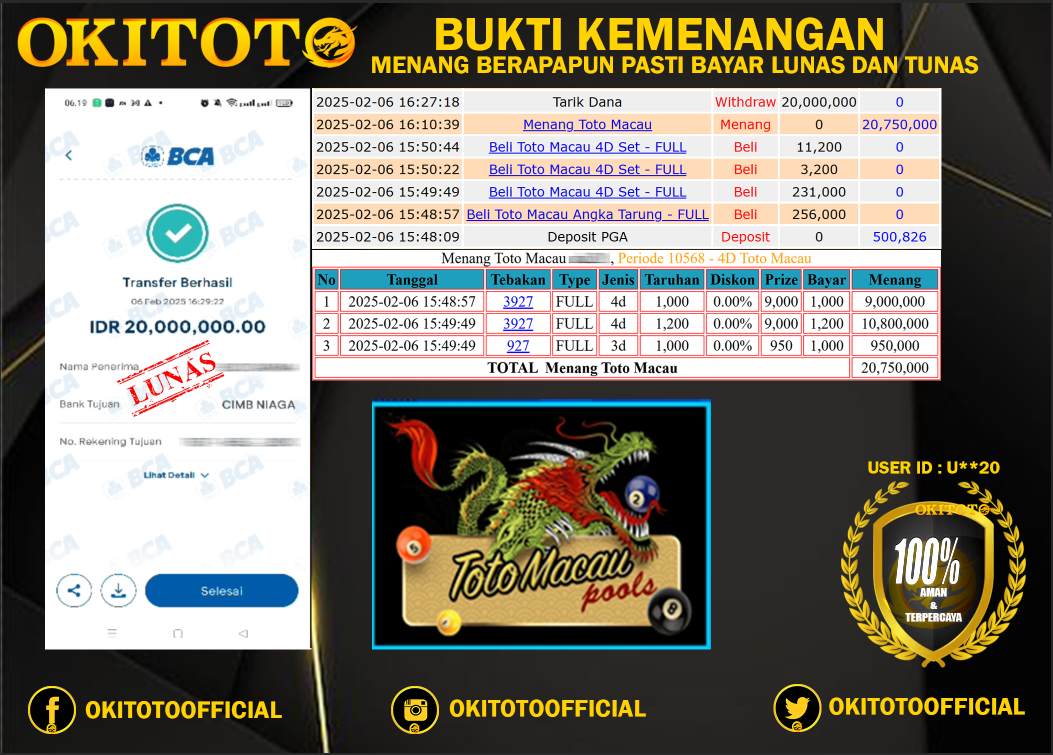 Berikut adalah bukti bahwa OKITOTO mempunyai integeritas yang tinggi dan dapat dipercaya semua orang, bukti jackpot berikut juga merupakan pembuktian yang kuat dan dapat dipertanggung jawabkan oleh pihak OKITOTO. Selamat kepada member kami dengan user id U**20 telah memenangkan jackpot di situs okitoto.